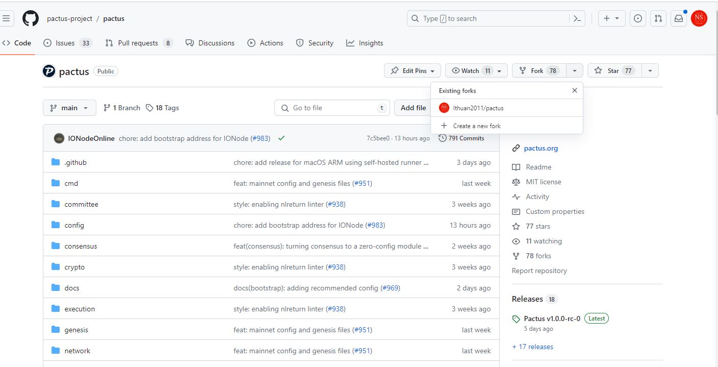 <figure><img src="https://2585830168-files.gitbook.io/~/files/v0/b/gitbook-x-prod.appspot.com/o/spaces%2FRzXvi3emVKzTi94K7StD%2Fuploads%2Fwii9vVw0p5fx60FwHqE7%2Ffork-pactus.JPG?alt=media&#x26;token=6a37841e-28cc-425e-b008-3c3a89a9a902" alt=""><figcaption></figcaption></figure>